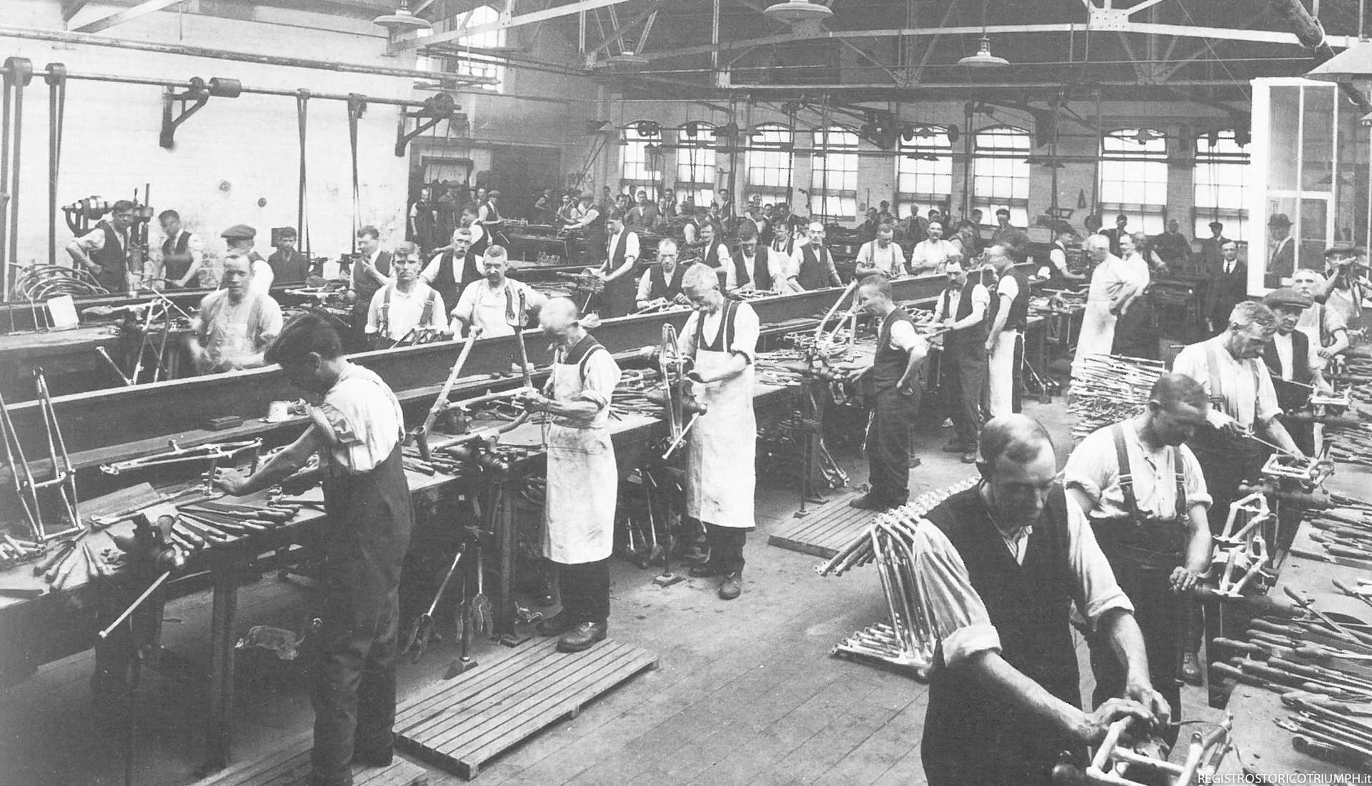 Although Triumph began making motorcycles in 1902 at their works in Coventry on Much Park Street, they used engines purchased from another company The business prospered and they soon started making their own. They’d purchased the premises of a spinning mill on Priory Street to develop a new factory.