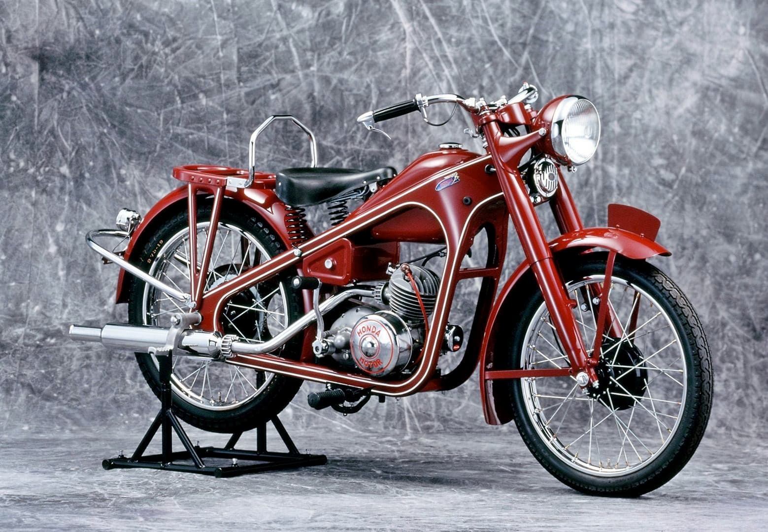 The Type D arrived in 1949 and was a true motorcycle with a pressed-steel frame designed and produced by Honda and with a 2-stroke, 98 cc, 3 hp engine. It became the first model in the Dream series of motorcycles.