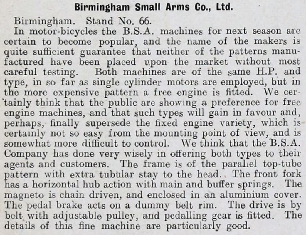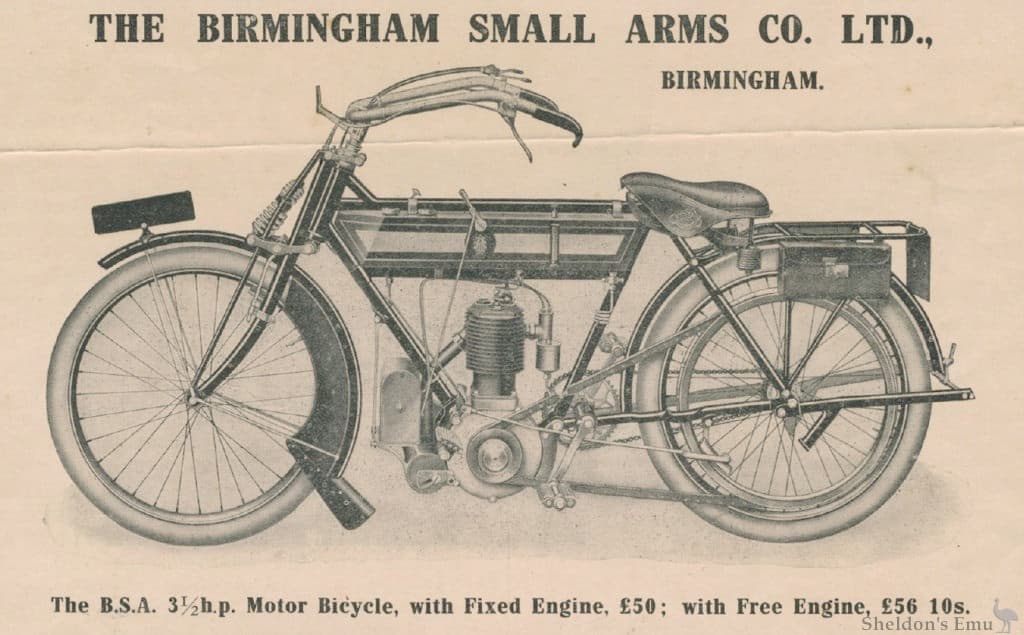 The machines were available for the 1911 season and entire production sold out. B.S.A. had previously acquired a commercially available engine in 1905 and fitted it to one of their bicycle frames and discovered at first hand the problems that needed to be overcome.
