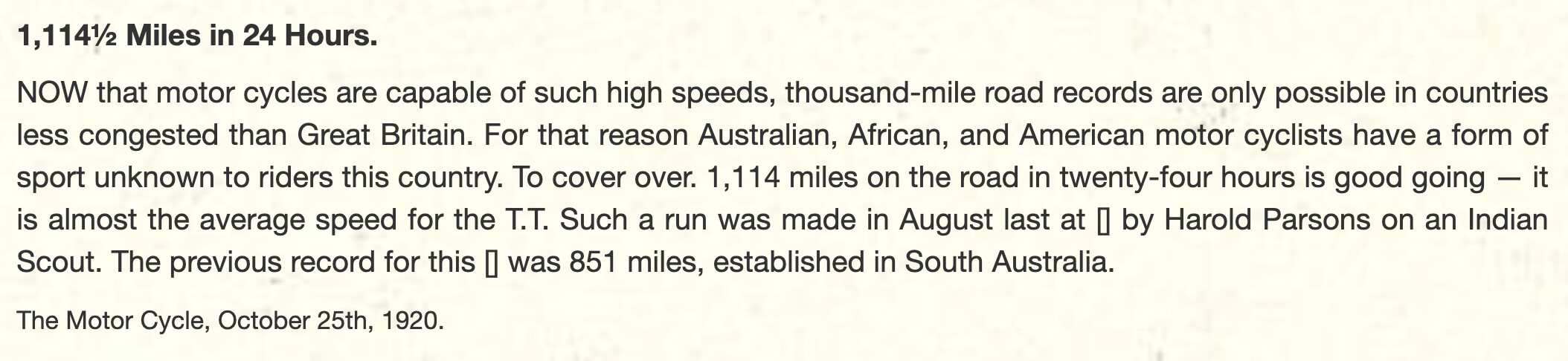 Over 100 years before Iván Cervantes took the world record for distance covered in 24 hours, The Motor Cycle reported on Australian, Harold Parsons, who set the record down under at 1,114½ miles (1793 km) in 1920 on his Indian Scout