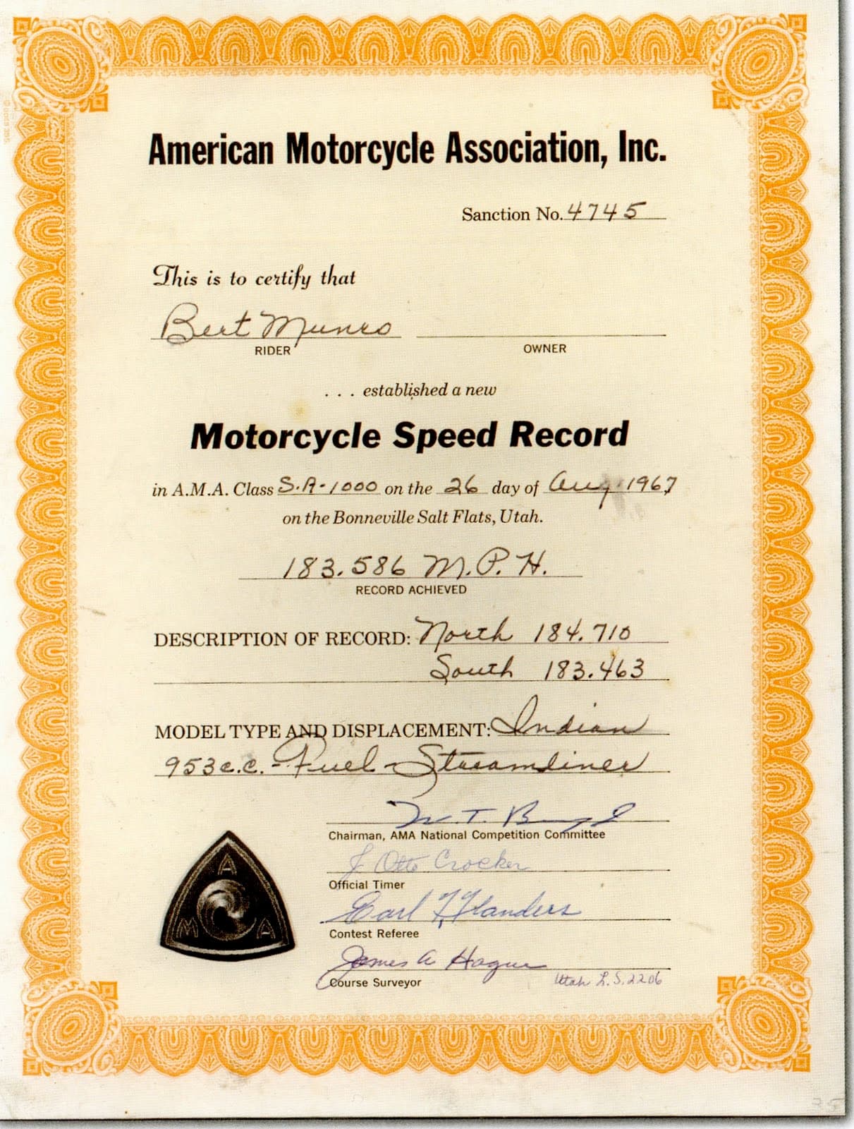 On his first trip to Bonneville with the Indian in 1962, Burt achieved a speed of 179 mph, which the people attending ‘Speed Week’ found unbelievable considering the age of both the bike and the rider.
