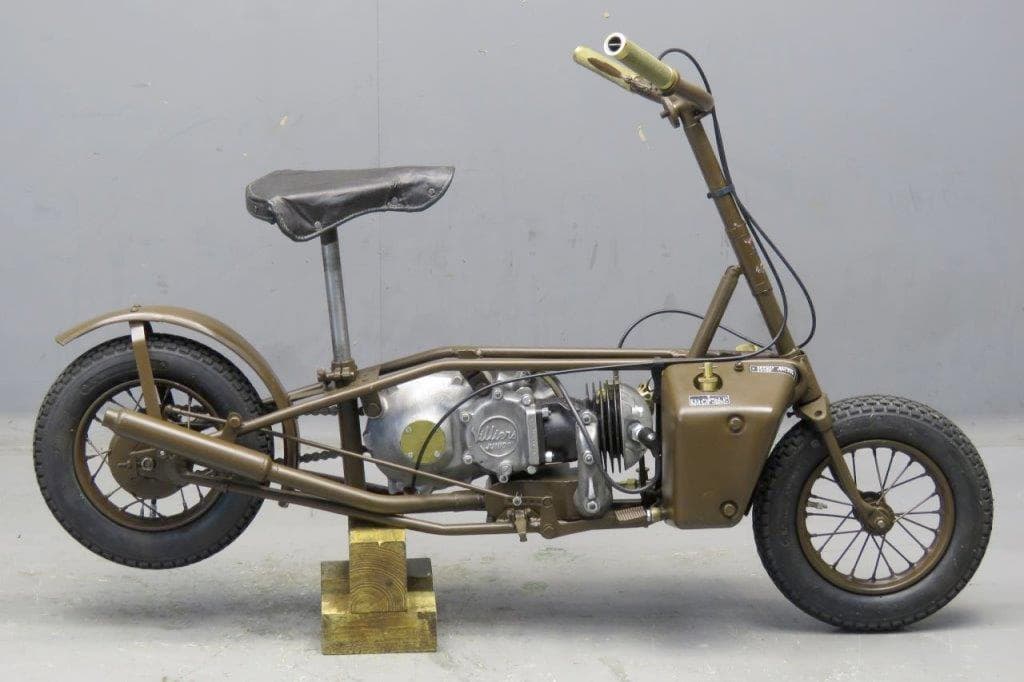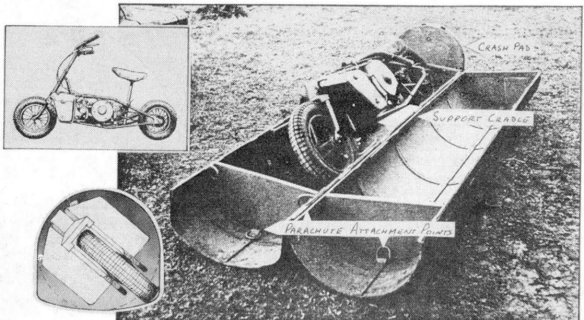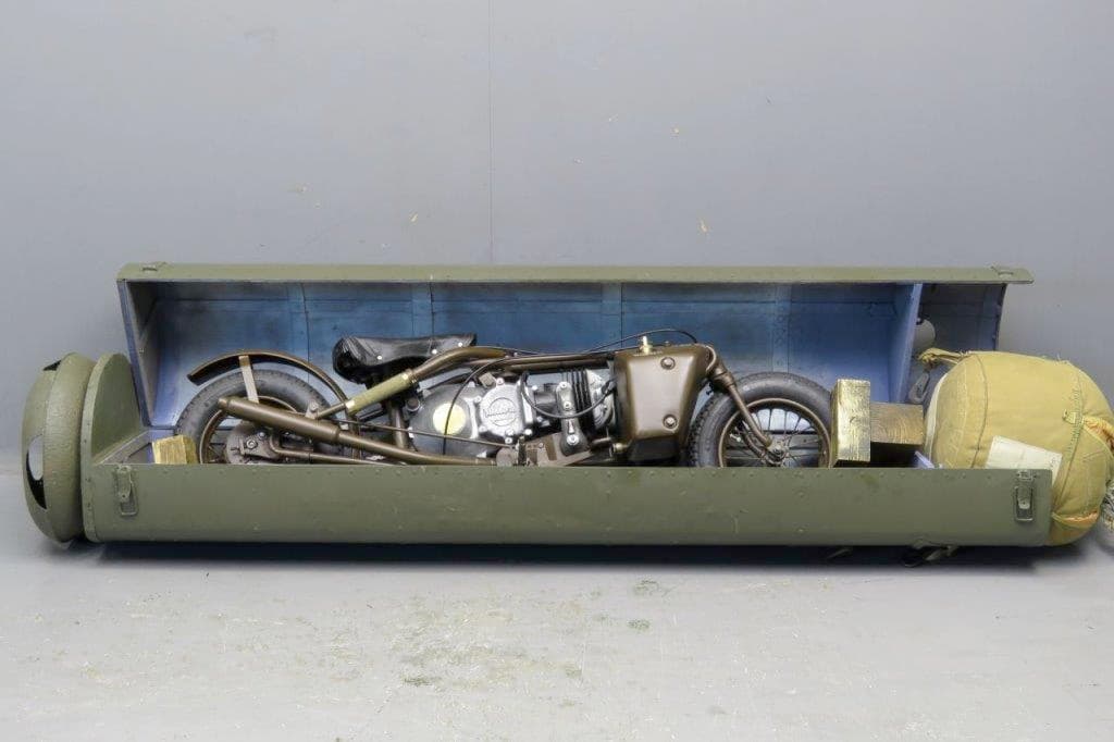 Once it hit the ground all that was needed was to twist the handlebars into position and lock them on spring-loaded pins. The saddle was pulled up and the footrests folded out ready to push start the two stroke engine and ride into action. The aim was that a paratrooper could remove the Welbike from its special green container and be on the road within eleven seconds.