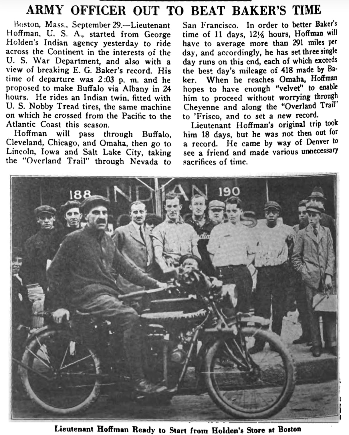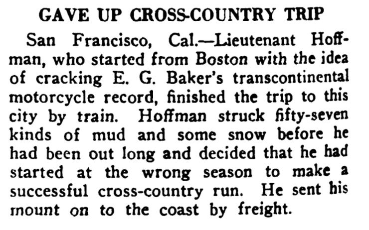 In 1915, Lieutenant Hoffmann, already a distance veteran, decided to try his hand at beating Erwin “Cannonball” Baker’s transcontinental record, on his Indian twin.