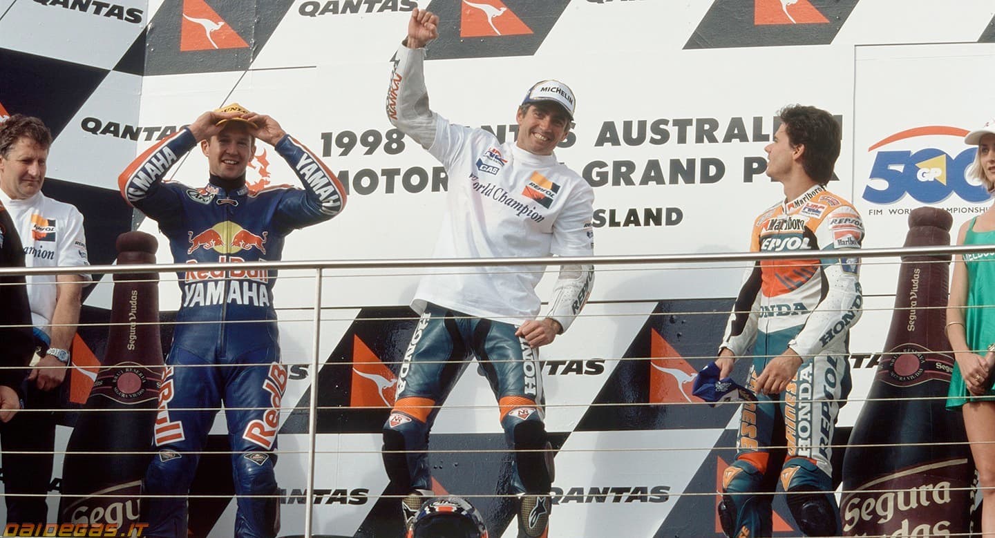 The relentless Mick Doohan secured his fifth consecutive, and final, 500cc Motorcycle Grand Prix Championship title at his home race on Phillip Island in 1998.