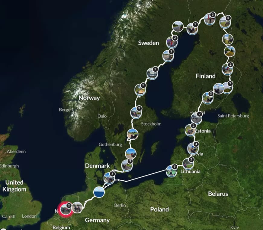I went from The Netherlands - through Germany, ferry to Denmark, across “the bridge” into Sweden and North towards Finland. South towards Helsinki, ferry to Tallinn. Across the Baltic States to Klaipeda, ferry to Germany and home from there.