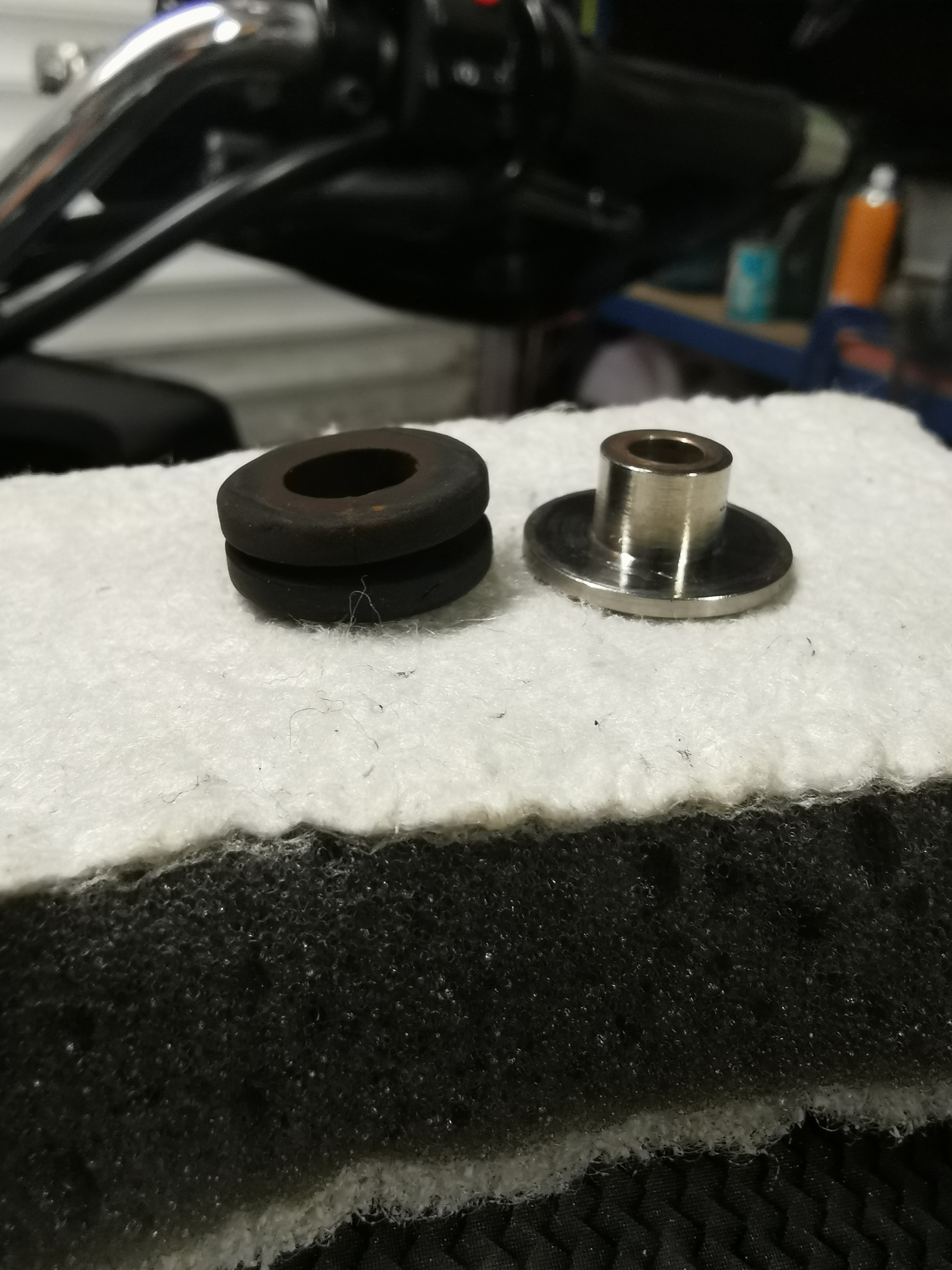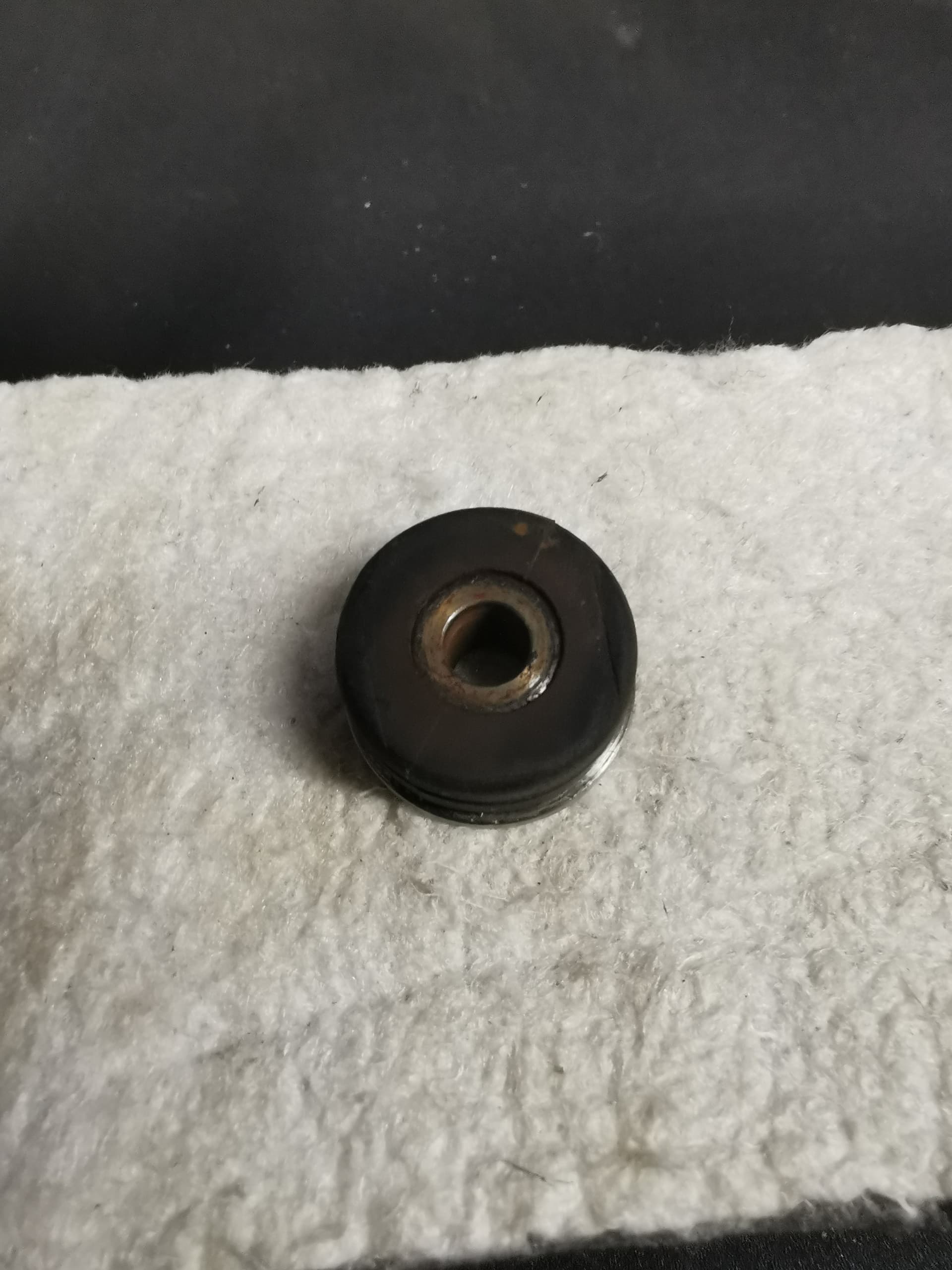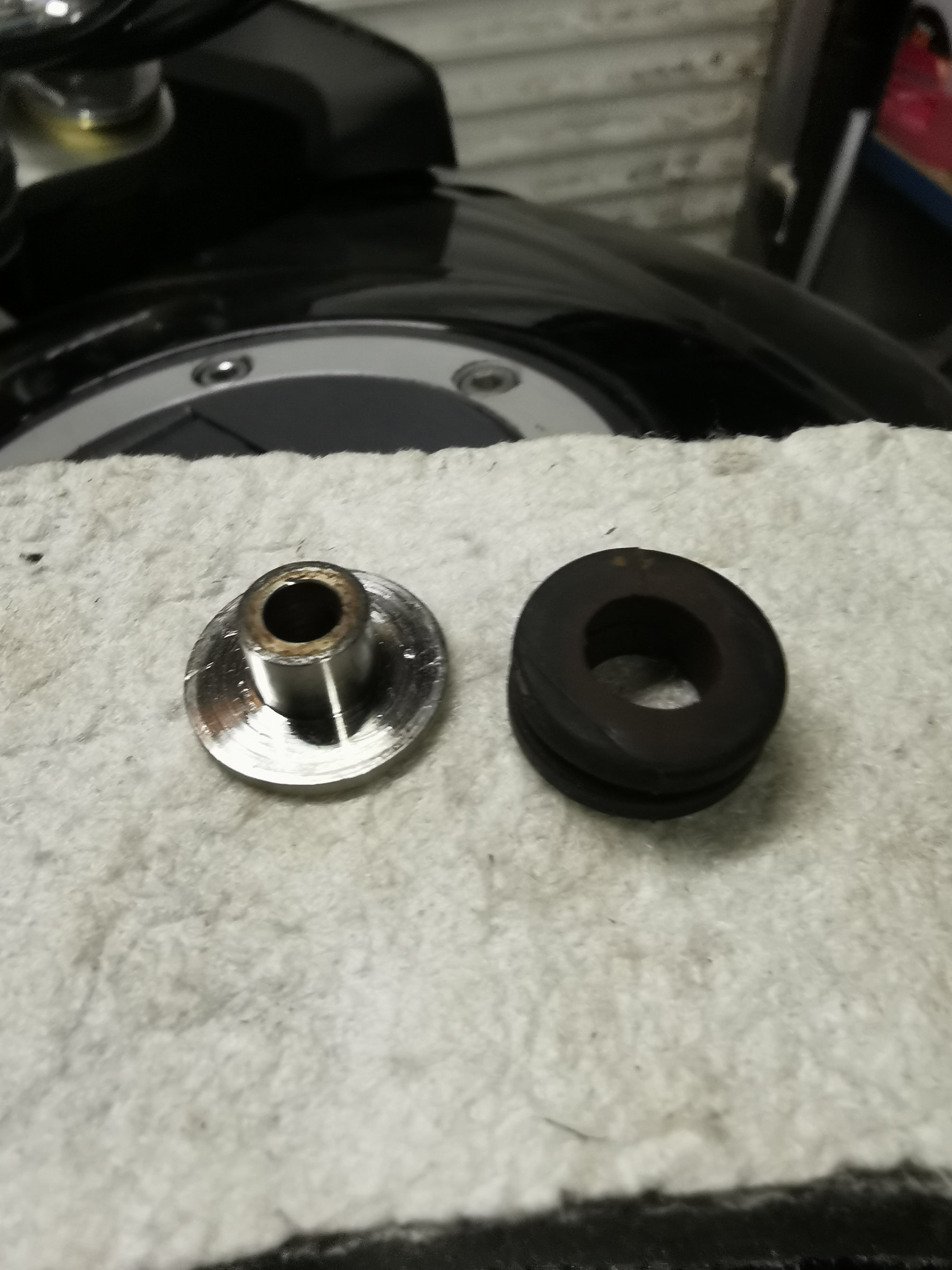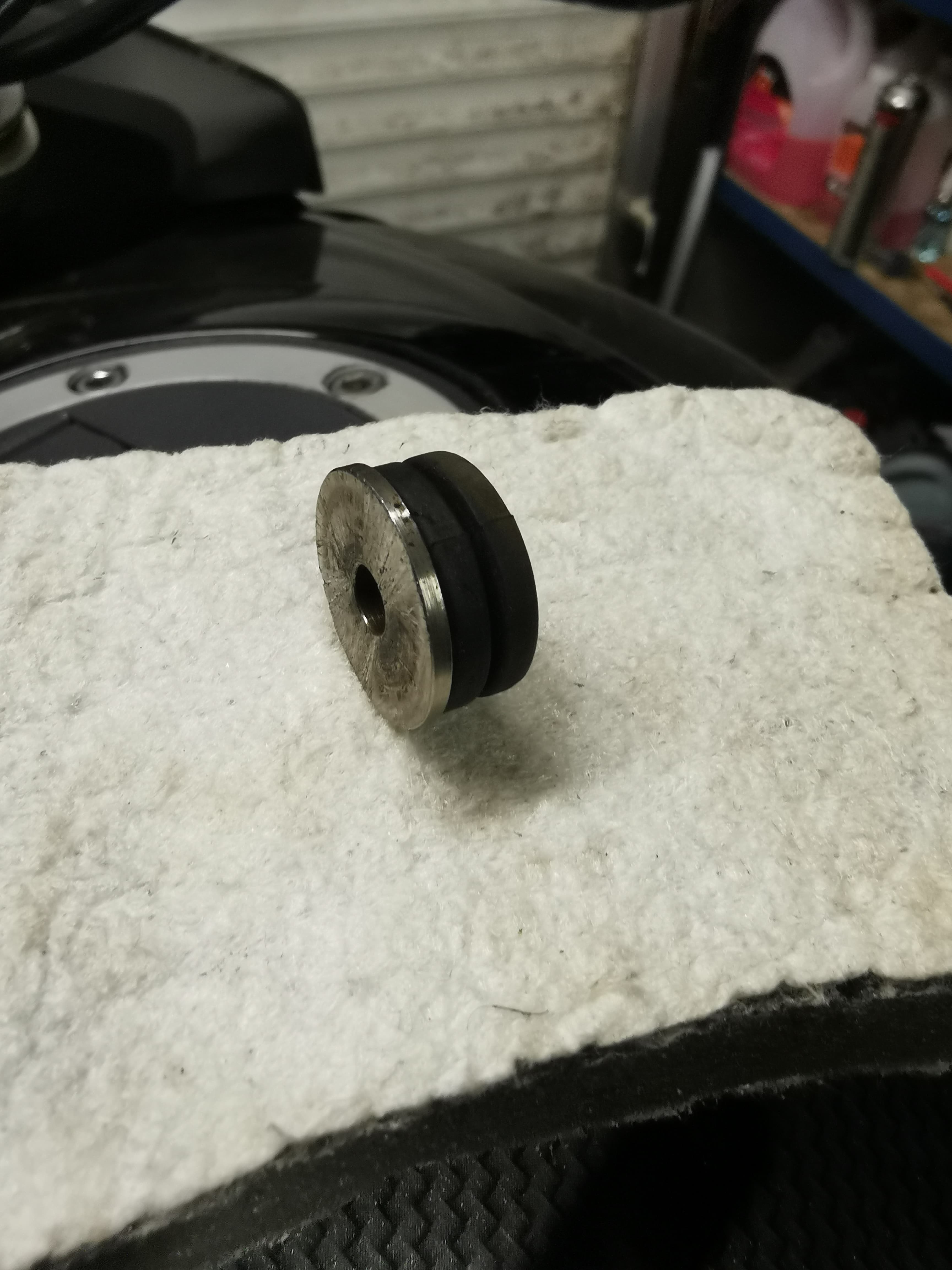 The slot around the rubber edge allows it to be fitted into the hole atop the radiator, the metal bushing goes through the rubber with the flange outer most… The bolt goes through the bushing and the rubber squishes between the flange and the frame!