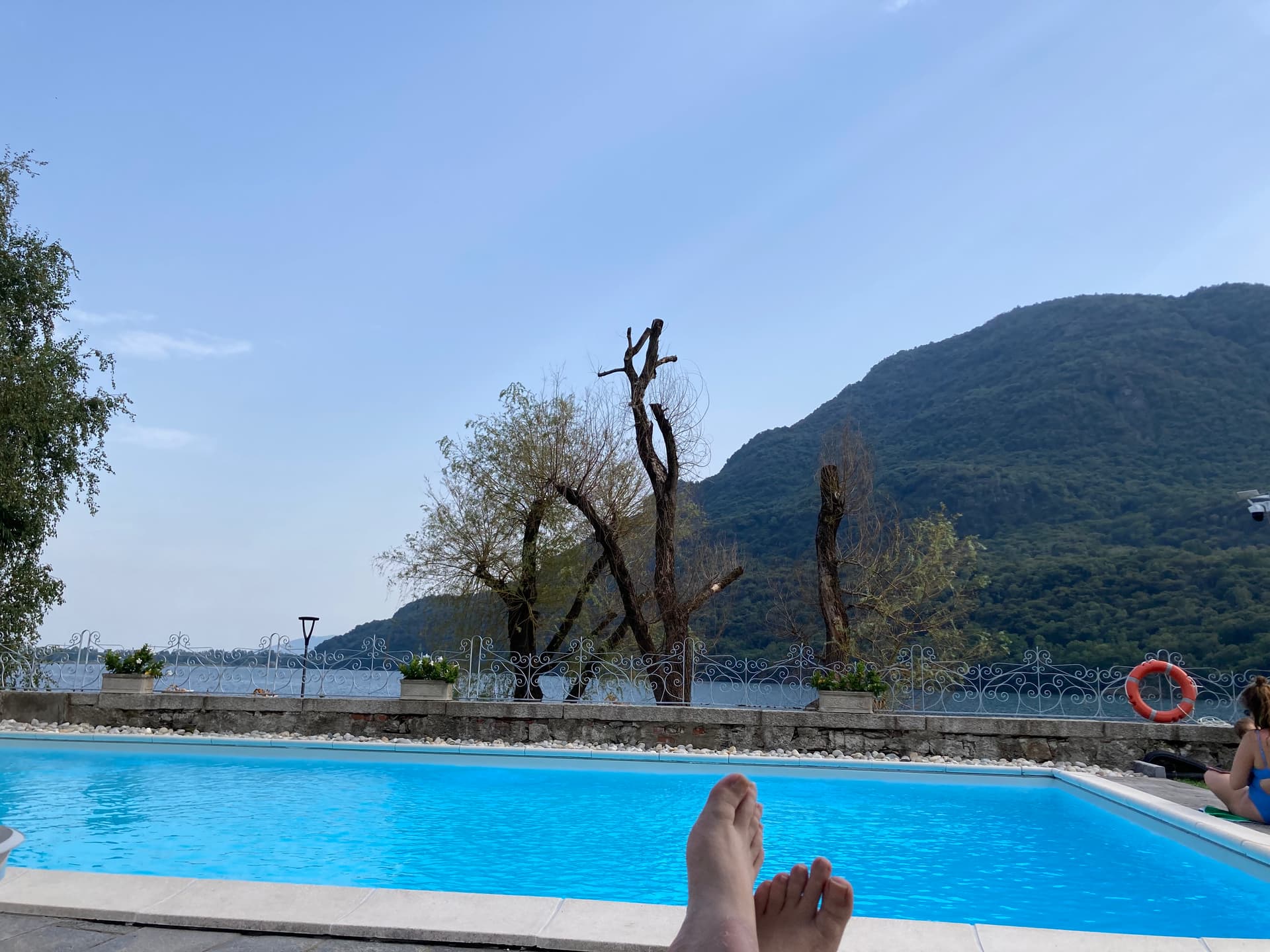 Then next day we jump several time between Swiss and Italy with some nice pass, Julierpass, the mighty Chiavenna Splugen pass, where we needed several time to stop to allow cars on our side of the road to take the curves, then rode along Italian lakes, Como, lago Maggiore, Lugano lake, and stayed on the side of Mergozzo lake. Very hot day, but we had a swimming pool directly over the lake ![]()