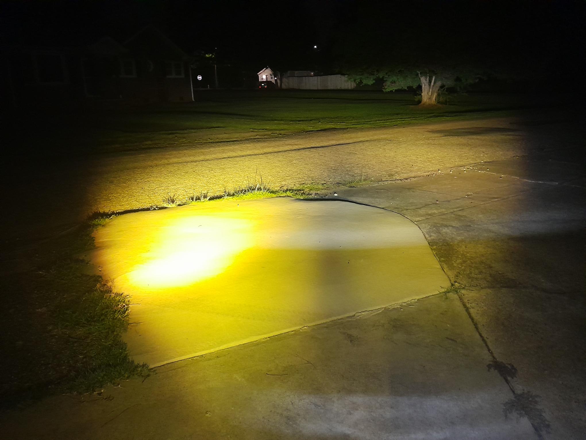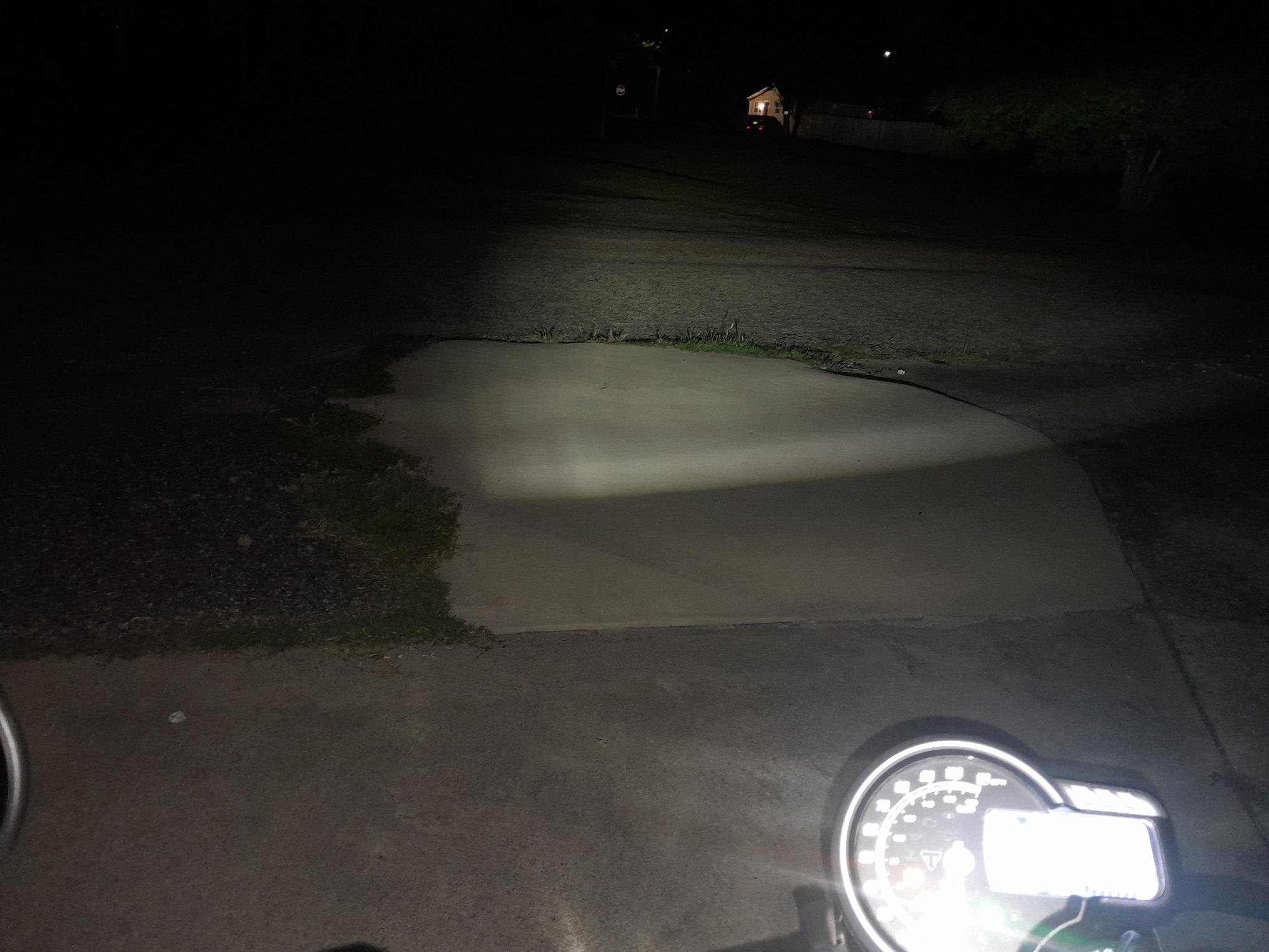 Both pics are without the engine running and the bike on my uneven driveway. They do add lots of additional light at night. I powered them from the battery charge pigtail as to not void any warranty concerns.