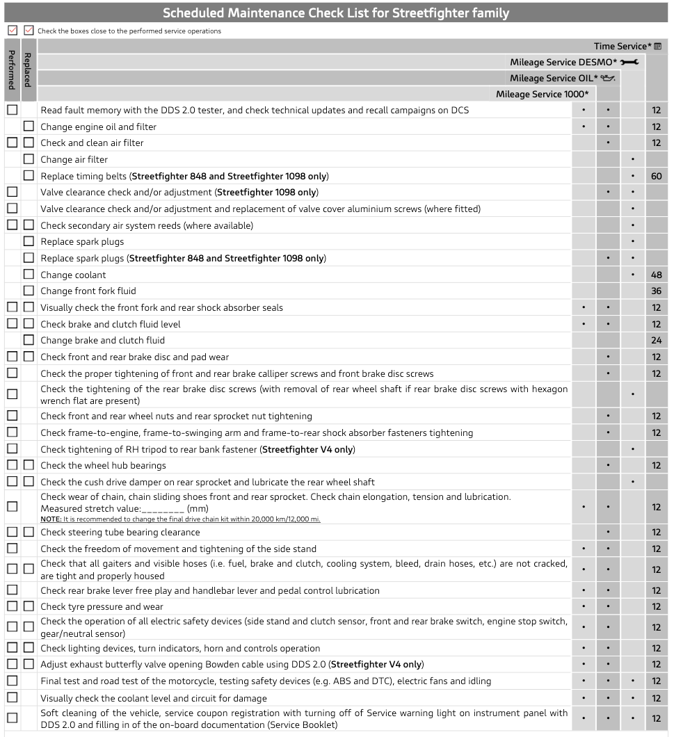 This is the checklist for the 848. The Desmo service also includes everything in the Mileage Service OIL column, which is everything apart from brake/clutch fluid and fork oil, unless the timing means they’re due as well.