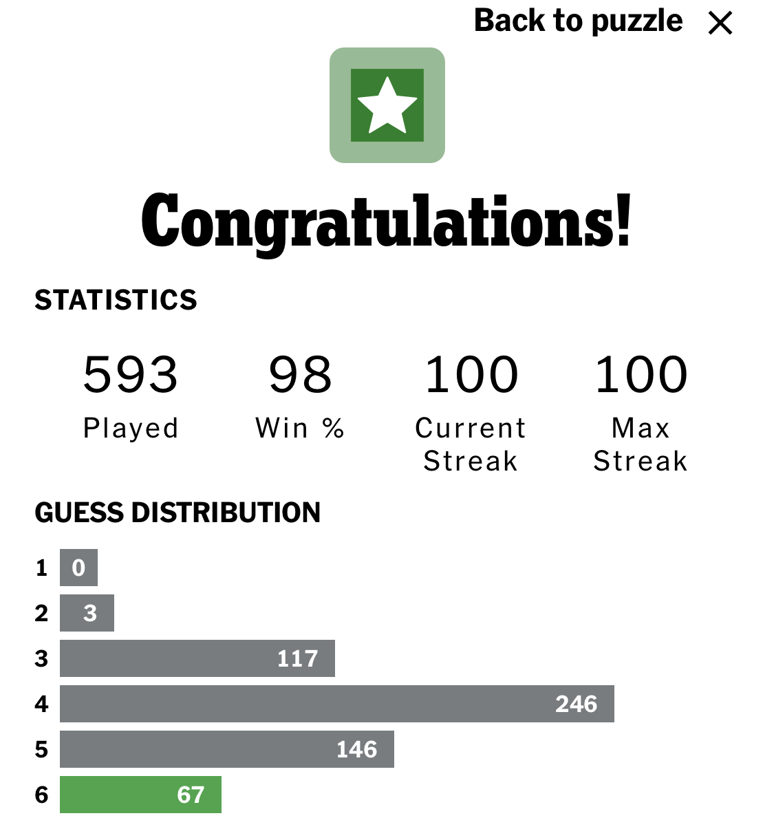 I know it’s an unpleasant trait, but my vanity is such that I must tell someone… finally, after several years sitting on the sh!tter, or scratching me ‘ead at kitchen table… I won 100 wordles in a row. As a daily noggin challenge, there’s a little commitment to this, I normally fail around days 60-70.