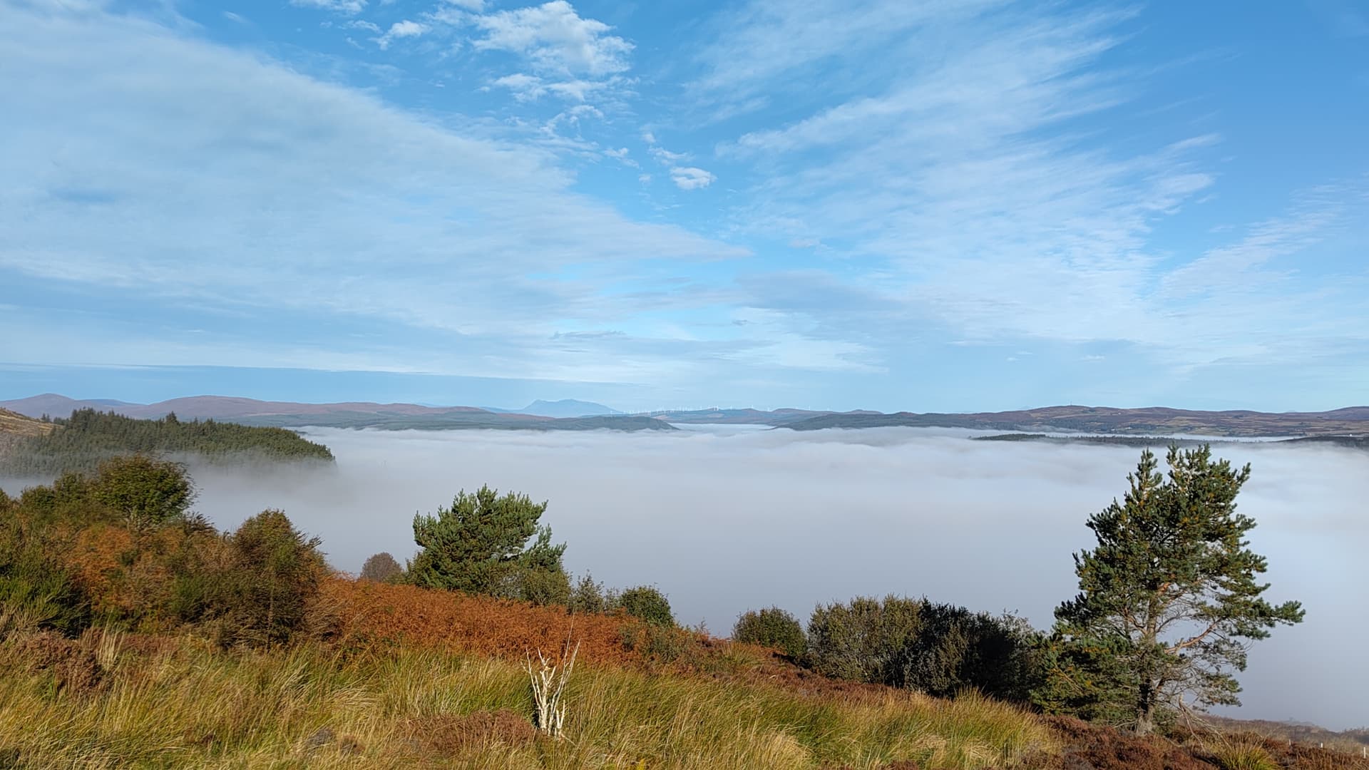And when I left my digs in the mist it was a full 5°C. Was difficult to see road in the mist, with mist also on inside and outside of visor, so rode with it up on the single tack road until it occurred to me that 4 days ago I came in on a propper road. Doh! Turned around to head back to Lairg and get on correct lane-each-way road. Still difficult going with visibility and when satnav led me up road with a warning sign saying ‘Subject To Icing’ I thought ‘great, just what I need’. Actually it was, icing risk was because of altitude and it led me into the sun above the mist.