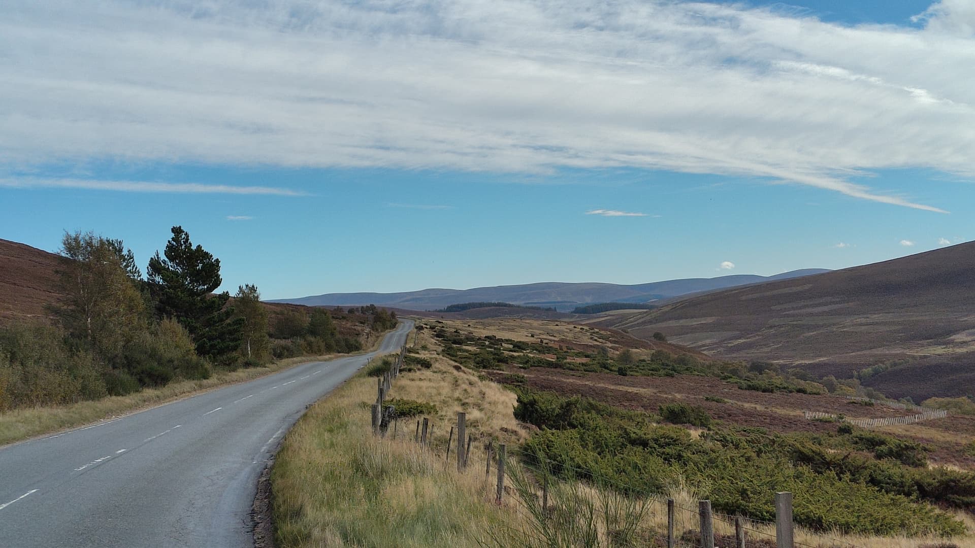 The road south into Braemar is a fast A road through forest, and cruising along at 60 starts to feel a lot faster when the rows of trees at the roadside flash by.