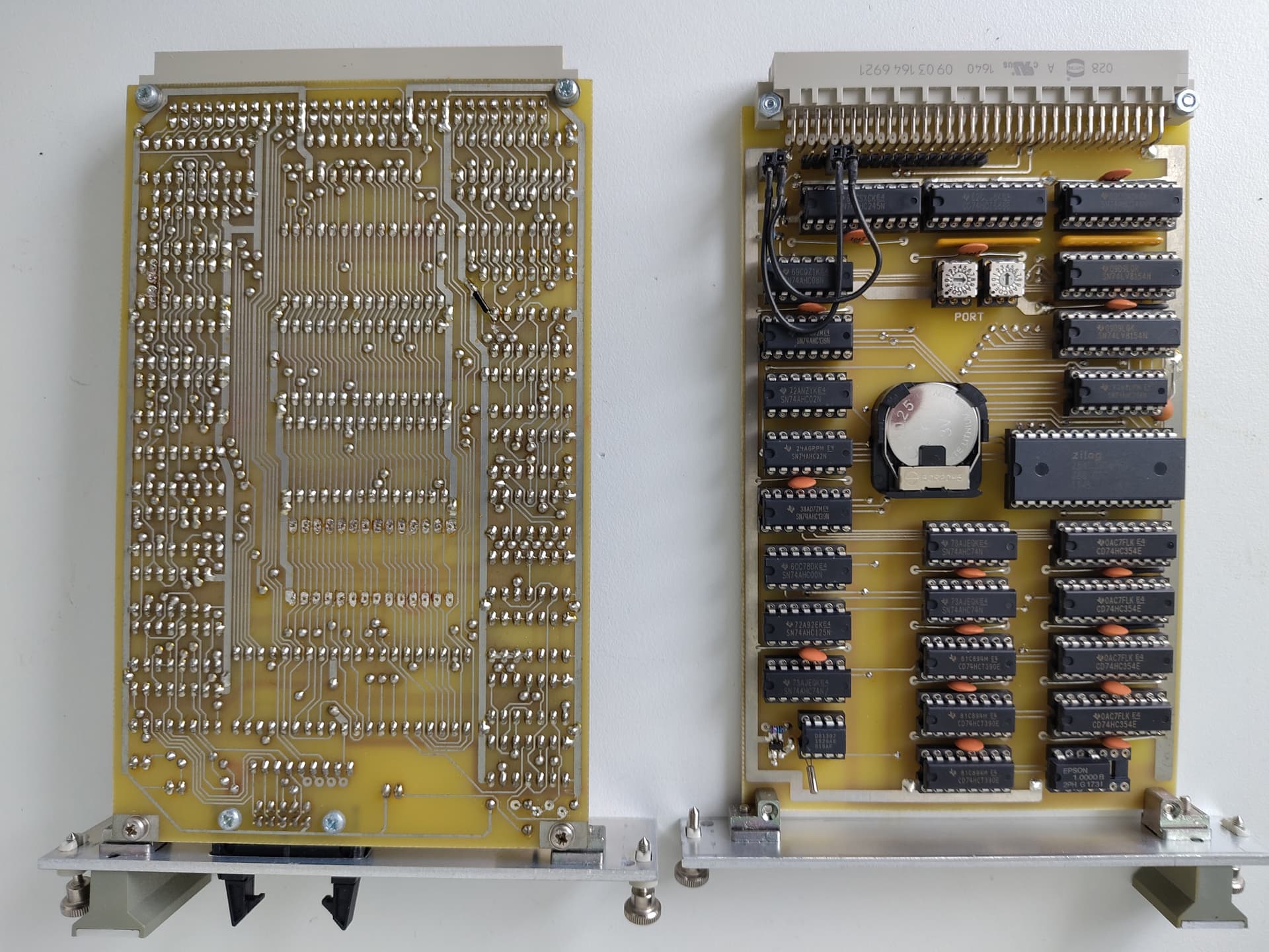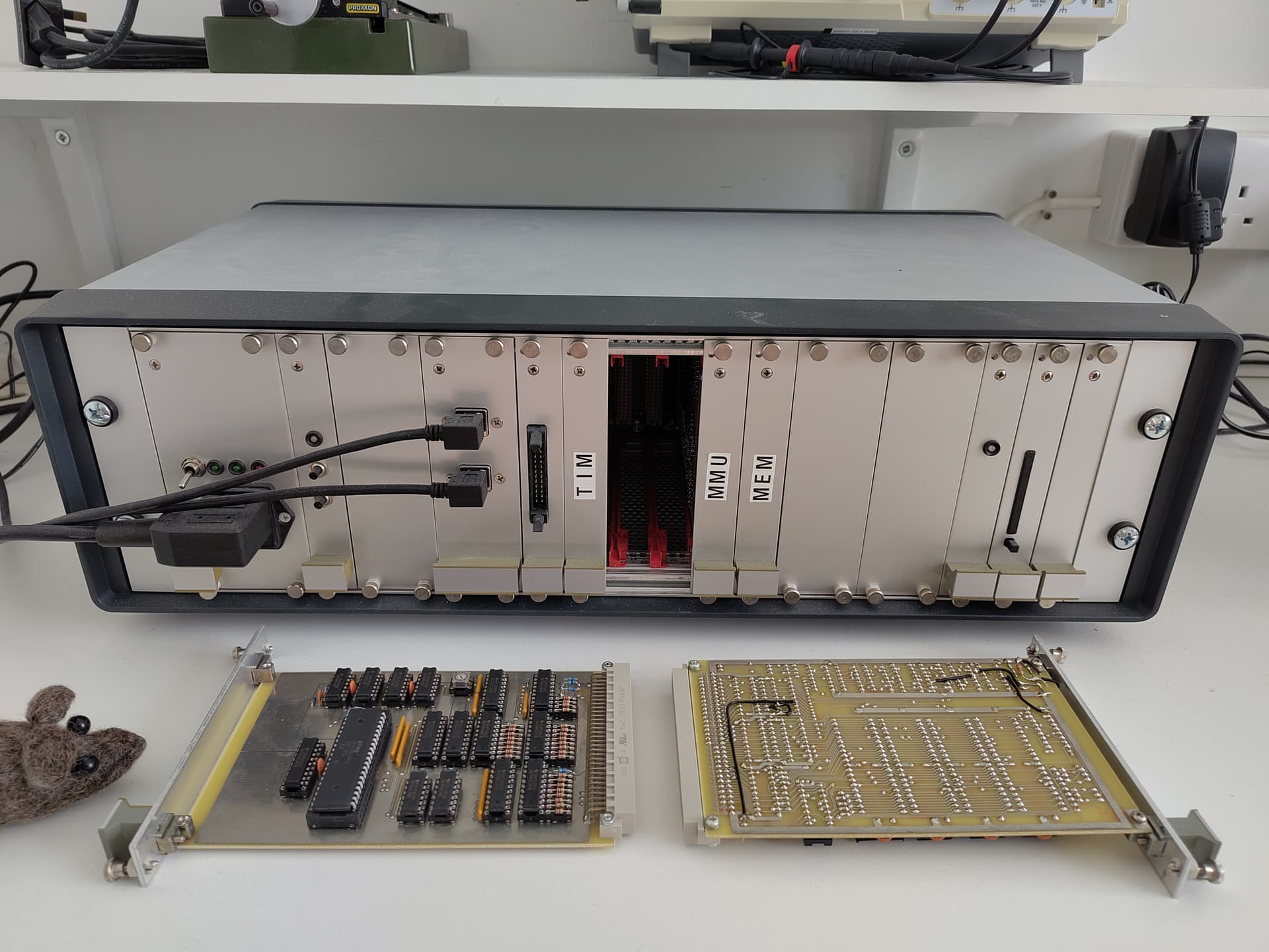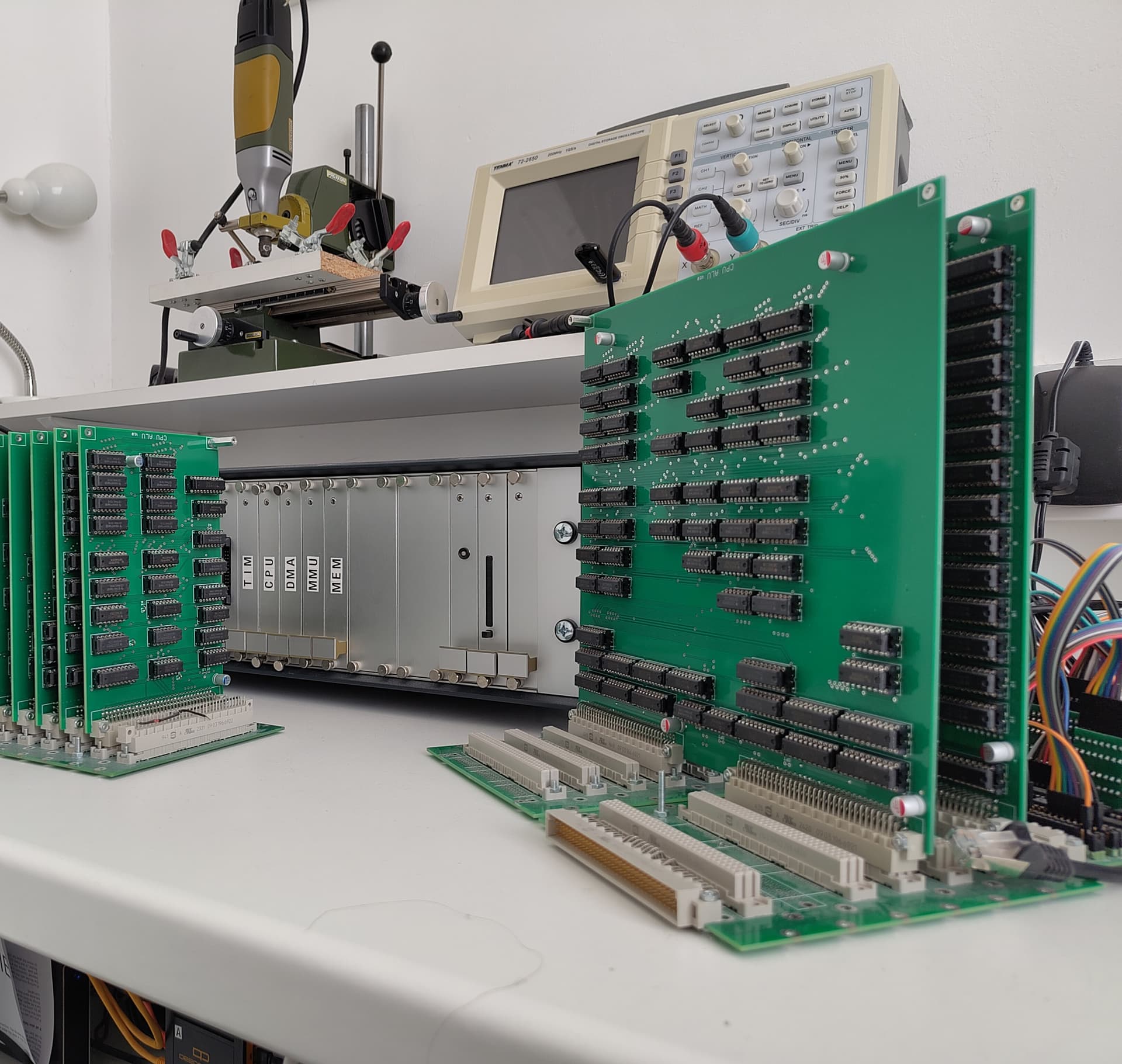 By the time I had added a proper RS232 serial port to my system as a second PCB I realised I had definitely got the bug and my ambition was growing. Wanting a more professional look, I bought a load of parts to construct a smart desktop 19-inch rack system, and for better quality PCBs, a German made all metal drill and press, some chemicals for tinning the copper traces, and a load of teeny-tiny rivets (0.6mm diameter).