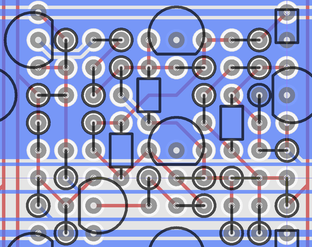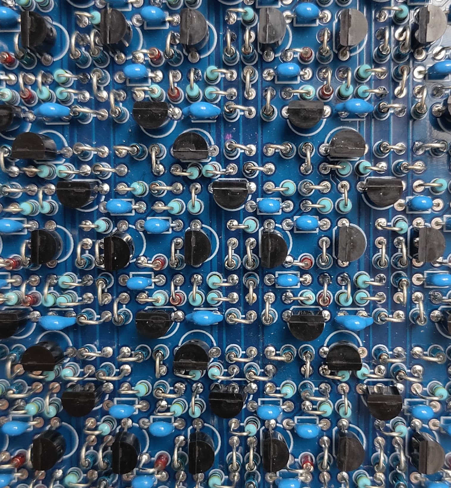 Now came the part I think I find most enjoyable, redesigning the PCB layout. I had to fit the new circuit into the same size as the old one so I could still fit 48 of them on the PCB and also get the traces for the control lines to them. After a few days I got the layout to work so the copper tracks on both sides of the board could connect things up. (Blue and red lines in the pic.)