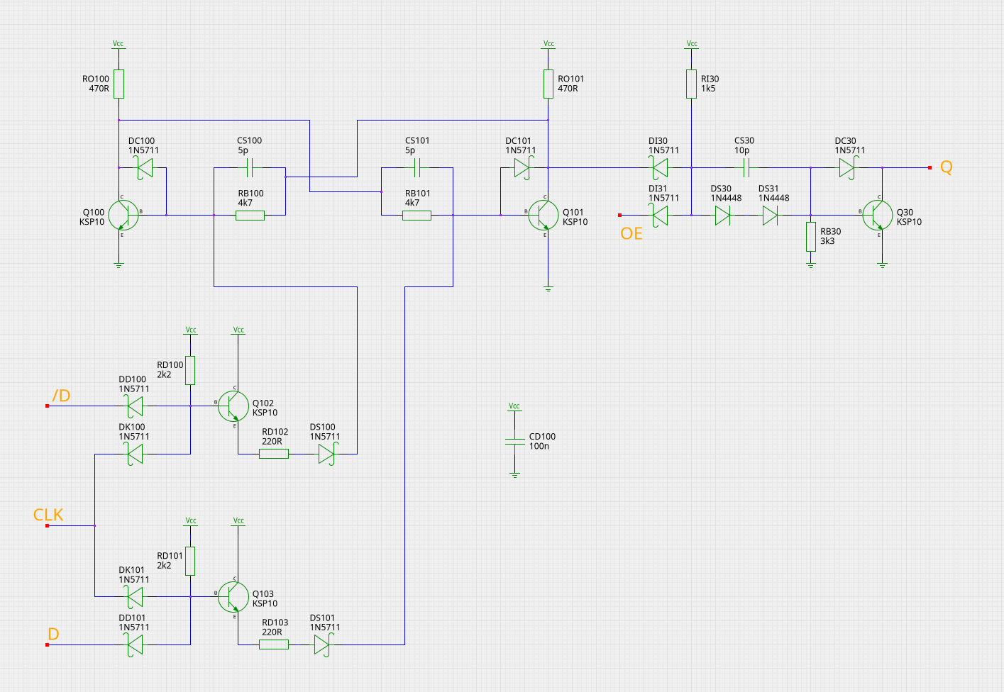 After a few days experimenting and tweaking I settled on a new flip-flop design with two extra transistors on the inputs, here’s the circuit diagram, because I know you’re interested ![]()