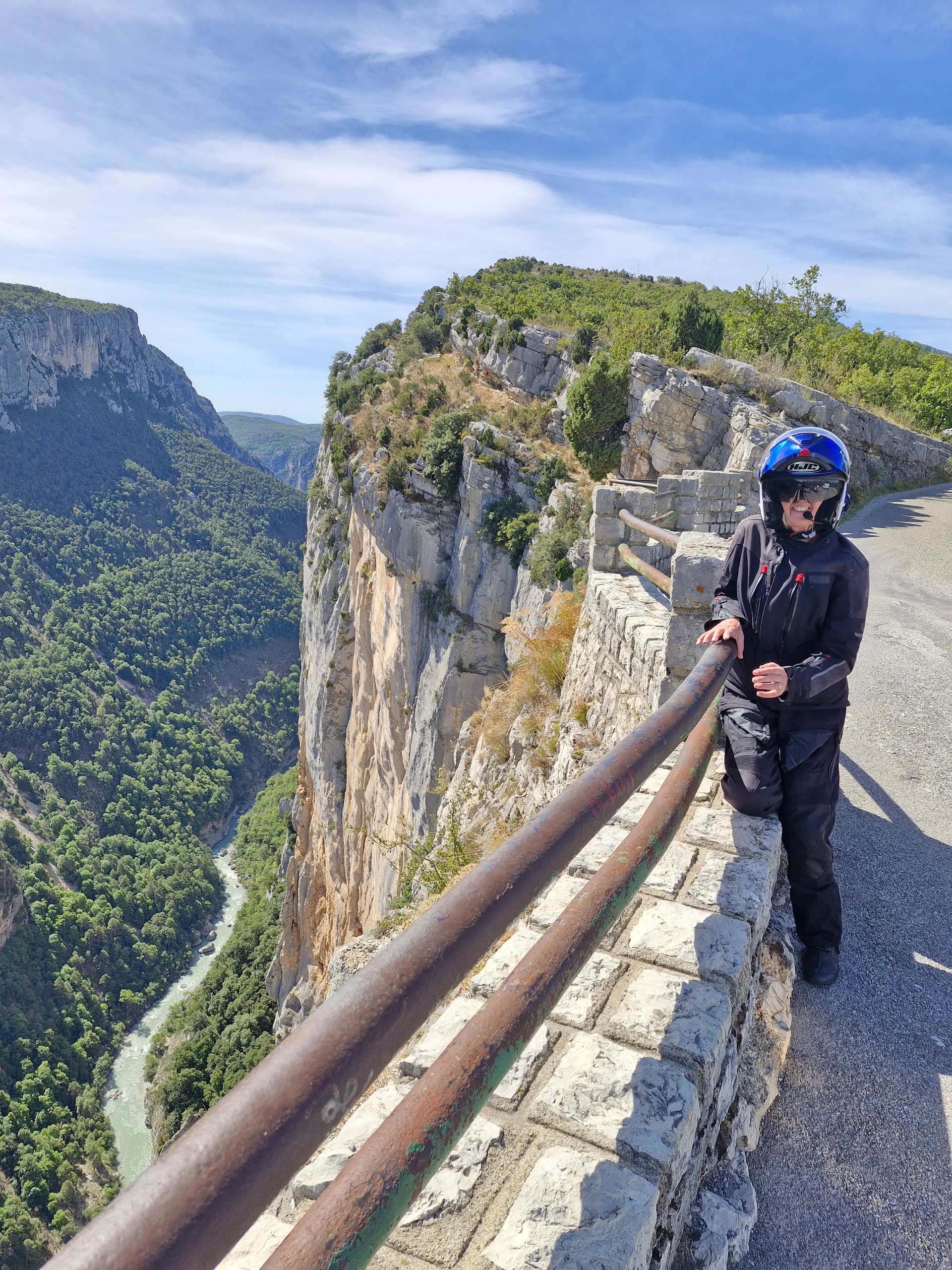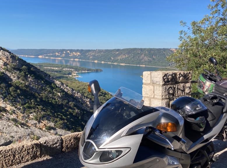 Wow! What a road. As luck would have it, Hubaxe’s suggestion of le Lac de Sainte Croix was on our planned route today. We took a detour, following a group of Italian bikers onto the Route du Crete and saw eagles soaring on the air currents rushing up the Verdon gorge. Great ride, but not for vertigo sufferers…Through Castellane on another great road over a barrage, but spoiled by some clown who had spilled diesel on every corner for about 6 miles, made worse by piles of sand thrown over it. Anyway, into Annot for the night and a beer, pizza and walk around this pretty little historic town. During the day, Rose got rather overheated so I stopped for her to cool her “bits” in the river…Route des Alpes beckons tomorrow.