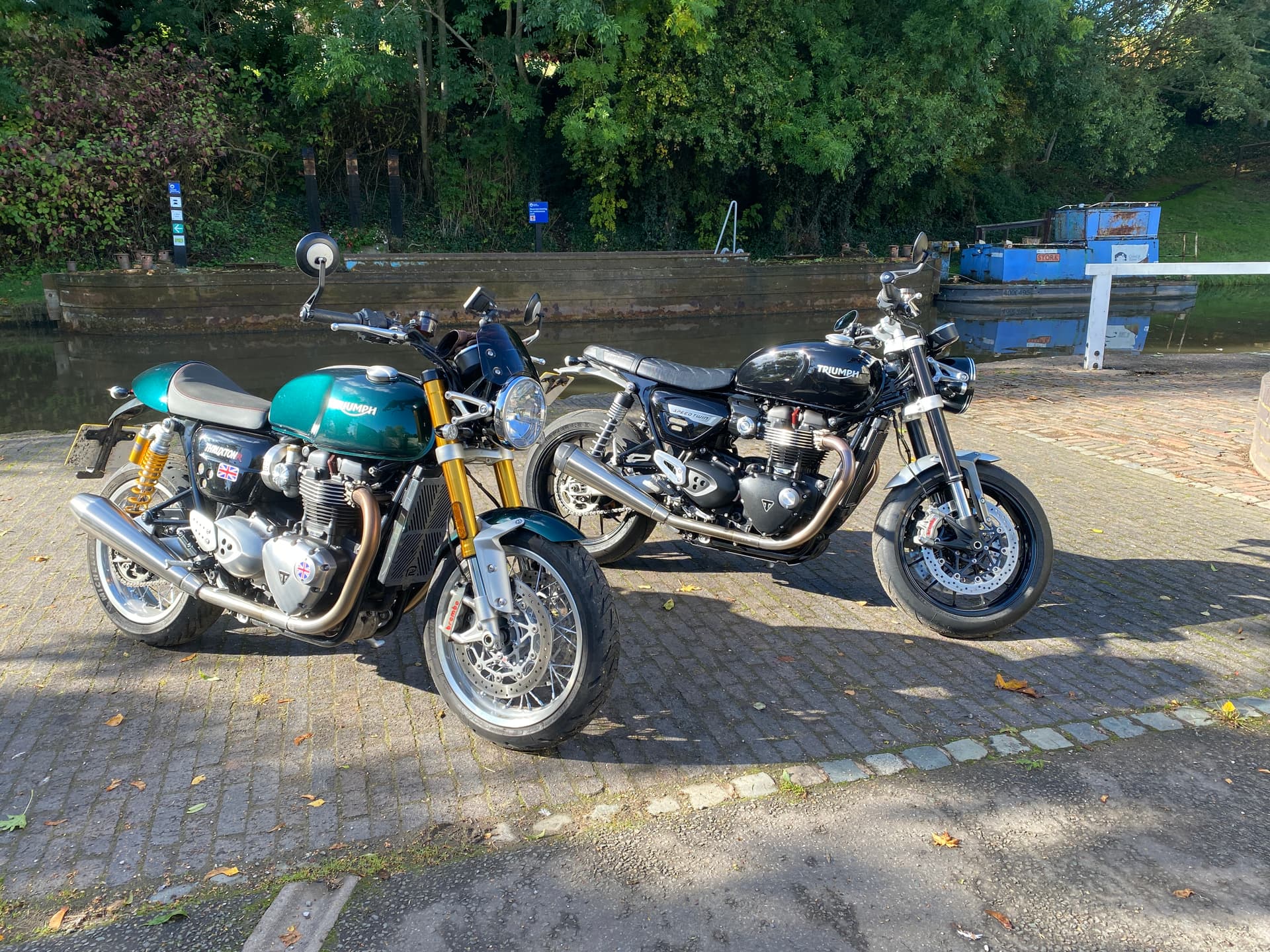 Brilliant autumn day for ride on the Thruxton with a mate on his new Speed Twin. Stopped in Audlem for a quick photo before heading to Ma Bakers for a coffee. Lovely day for a ride.