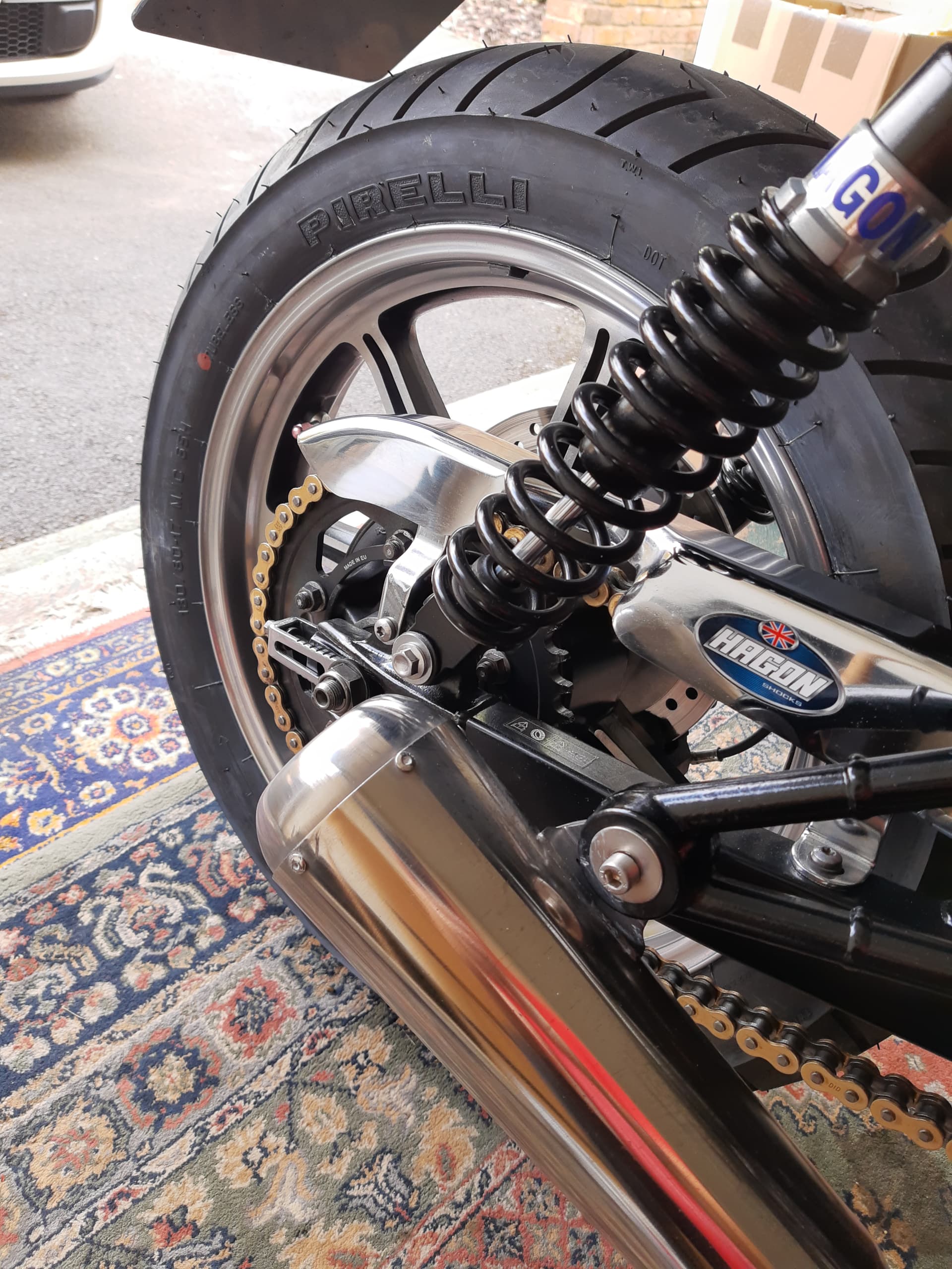 Nice shiny new sprocket and chain and a new Pirelli Sport Demon on my Bonnie. I’m sure it’s just phycological but it all feels much tighter and crisper to ride.